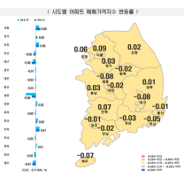 5대 광역시(부산·대구·광주·대전·울산) 아파트값은 0.04%로 떨어졌는데, 부산(-0.03%→-0.05%), 대구(-0.06%→-0.08%), 대전(-0.01%→-0.02%)에서 하락이 두드러졌다. 매물적체가 지속 중인 세종도 -0.08% 하락률을 보였다. 박원갑 KB국민은행 부동산수석전문위원은 “서울 등 수도권의 반등 추세는 좀 더 이어질...