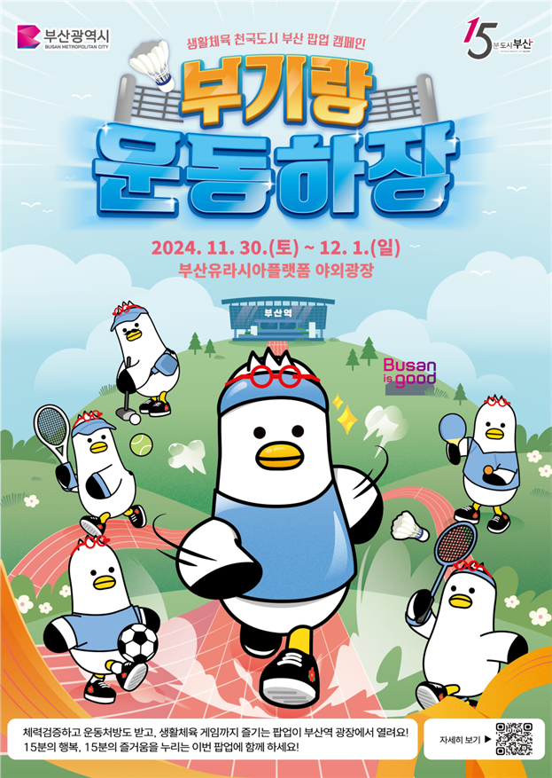 박형준 부산시장은 “이번 캠페인이 생활체육과 스포츠를 통해 부산을 더욱 활기차게 만드는 계기가 되길 바란다”고 밝혔다. 생활체육의 매력을 느낄 수 있는 「부기랑 운동하장」을 꼭 경험해보길 추천한다.
