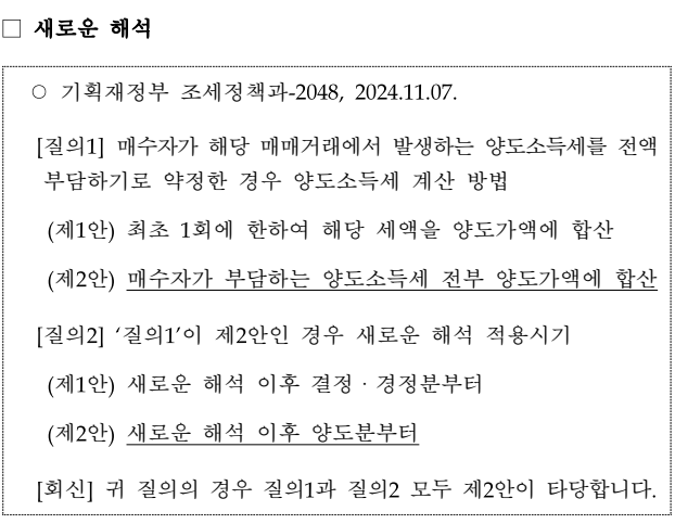 양도소득세 전액 합산 방식이 변경된다. 기존에는 매수자가 부담한 첫 번째 양도세만 양도가액에 포함되었으나, 새로운 해석에 따르면 매수자가 책임지는 모든 양도세를 양도가액에 합산해야 한다.
