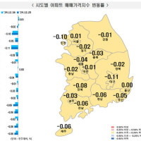 자치구별로 보면 서초구(0.06%)는 반포·잠원동 주요 단지 위주로, 송파구(0.04%)는 문정·방이동, 강남구(0.03%)는 개포·대치동 재건축 추진 단지... 시도별로 울산(0.00%)은 보합을 기록했고, 대구(-0.11%), 인천(-0.10%), 전북(-0.08%), 제주(-0.06%), 경남(-0.06%), 전남(-0.06%), 부산(-0.05%), 충북(-0.03%), 광주(-0.03%) 등은...