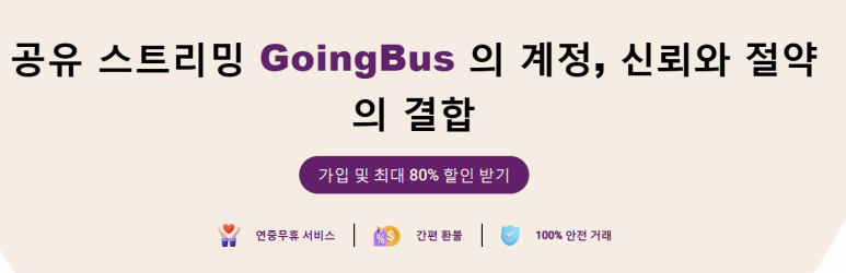 고잉버스는 유튜브 프리미엄을 비롯해 넷플릭스, 디즈니플러스, 스포티파이, ChatGPT Plus 등 다양한 스트리밍 서비스를 저렴하게 제공하는 공유 플랫폼이다.