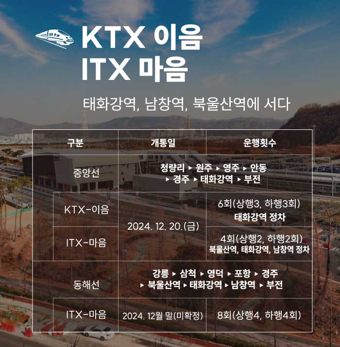 2024년 12월 20일부터 KTX-이음과 ITX-마음 열차가 태화강역에 정차하게 된다.